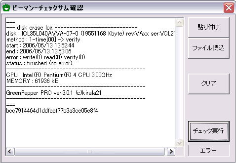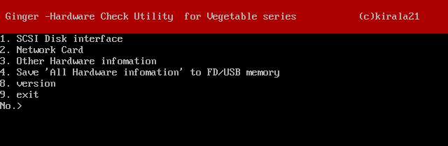 ---ダウンロードの場合--- 保存場所・・・[解凍したフォルダ]\Wintools ---CD-ROMで提供の場合--- 保存場所・・・[製品CD-ROM]\Wintools コマンドライン、バッチファイルなどで順に処理を行う場合、[gppro.exe]などのWindowsプログラムは、起動直後、すぐに次のステップに処理が移ってしまい、終了コードのチェックができないなど、不都合な場合があります。 その場合、[WaitWinProc.exe]を使用することにより、[gppro.exe]の終了を待って、次のステップに進ませることができます。 使用例 (通常) gppro.exe /m:4V /a:P1234 /f:fd /t IF ERRLEVEL ...... (処理を待たせる) WaitWinProc.exe gppro.exe /m:4V /a:P1234 /f:fd /t IF ERRLEVEL ...... 保存場所・・・[製品CD-ROM]\Wintools ![]() 「ピーマンPRO」 「Windows実行プログラム」における、レポート、 「製品CD-ROM」起動、「実行用FD/CD-ROM」起動時の、ログファイル、 の正当性(プログラム出力後改変されたものでないか)をチェックするプログラムです。 使用法 画面に、レポート/ログを読み込み、「チェック実行」ボタンによりチェックを行います。 クリップボードにコピーしたレポート/ログの場合、「貼り付け」 ファイルに保管したレポート/ログの場合、「ファイル読込」 を使用して読込ます。 「クリア」により画面がクリアされます。 正当な内容である場合、「チェックOK」 正しくない場合、「エラー:フォーマットエラー/チェックサム不一致」 とメッセージが表示されます。 ログ/レポートの構成 構成単位は === (レポート/ログ内容) === (チェックサム) です。この単位でコピー、ファイル保管等を行い、チェックしてください。 ---ダウンロードの場合--- 保存場所・・・[解凍したフォルダ]\Wintools ---CD-ROMで提供の場合--- 保存場所・・・[製品CD-ROM]\Wintools ![]() フロッピーディスクの内容をイメージファイルとして保管、また、保管したイメージファイルをフロッピーディスクに書き込むためのプログラムです。 「ピーマン」において、オプション指定などを加えた「実行用FD」をファイルとして保管し、使用者がFDに書き込んで使用する場合などに便利です。その際、オペレーションを楽にする、コマンドラインオプションも用意しています。 使用法 ・「変換方向」を選択。「イメージファイルからFD」:上方向矢印、「FDからイメージファイル」:下方向矢印。 ・「3.5インチFD」のドライブを選択。 ・「イメージファイル」を指定。参照ボタンを使用すると便利です。 ・「変換実行」ボタン コマンドラインオプション ・変換方向の指定: /f:fd [イメージファイル->FD]、 /f:image [FD->イメージファイル] ・FDドライブの指定: /d:[ドライブ名] ※指定なしの場合、最初のFDドライブ ・イメージファイルの指定: /i:[イメージファイル名] ※スペースを含む場合""で囲む ・自動実行指定: /auto 使用例 fdimg.exe /f:fd /i:c:\temp\fd.img /auto "c:\temp\fd.img"ファイルから、FDに書き込む。起動と同時に自動実行。 ---ダウンロードの場合--- 保存場所・・・[解凍したフォルダ]\Wintools ---CD-ROMで提供の場合--- 保存場所・・・[製品CD-ROM]\Wintools ![]() システムがうまく動作しない場合の、ハードウェア環境の確認、 「実行用FD」を作成する際、どのSCSI/SATAドライバを組み込んだらよいのかなど、 ハードウェア情報を表示/FDに保存するためのプログラムです。 ginger.imgは1.44MBフロッピーディスクイメージファイルです。 上記「FDイメージファイルコンバータ 」を使用して、起動用FDを作成して使用してください。 プログラムの実行・・・FD起動 ・チェックを行いたいPCに「起動用FD」を入れ、FDから起動します。 ※FDから起動するよう、パソコンの設定(BIOS)が行われている必要があります。 ※USB-FDでも、パソコン側が起動に対応していれば、使用できます。 プログラムの実行・・・「ピーマンPRO」製品CD-ROMからの起動 「製品CD-ROM起動での操作-> 基本操作」をご覧ください。 使用法 No.>・・・ここに処理NOを入力し[enter] ・「SCSI Disk interface 」 「ピーマンPRO」、「だいこん」、「れんこん」製品における、SCSI/SATAディスクインタフェースの対応を調べます。 次画面で、搭載しているカードが対応のものの場合、[MODULE]欄に、[aic7xxx]のように対応モジュールが表示されます。 「ピーマンPRO」において、実行用FDを作成する場合、このモジュールを組み込んでご使用ください。 [MODULE]欄が「------」のものは、特にドライバの必要のないもの、あるいは非対応カードです。 ・「Network Card」 「だいこん」、「れんこん」製品における、ネットワークインタフェースの対応を調べます。 次画面で、搭載しているカードが対応のものの場合、[MODULE]欄に、[e1000]のように対応モジュールが表示されます。 [MODULE]欄が「------」のものは、非対応カードです。 ・「Other Hardware infomation」 CPU、メモリ、CD-ROM、USBなどの状況を表示します。 ・「Save 'All Hardware infomation' to FD/USBメモリ」 チェックしているパソコンの情報を、FD/USBメモリに保存します。FDは起動に使用したFDをそのまま使用します。通常の内蔵FDドライブ、USB-F